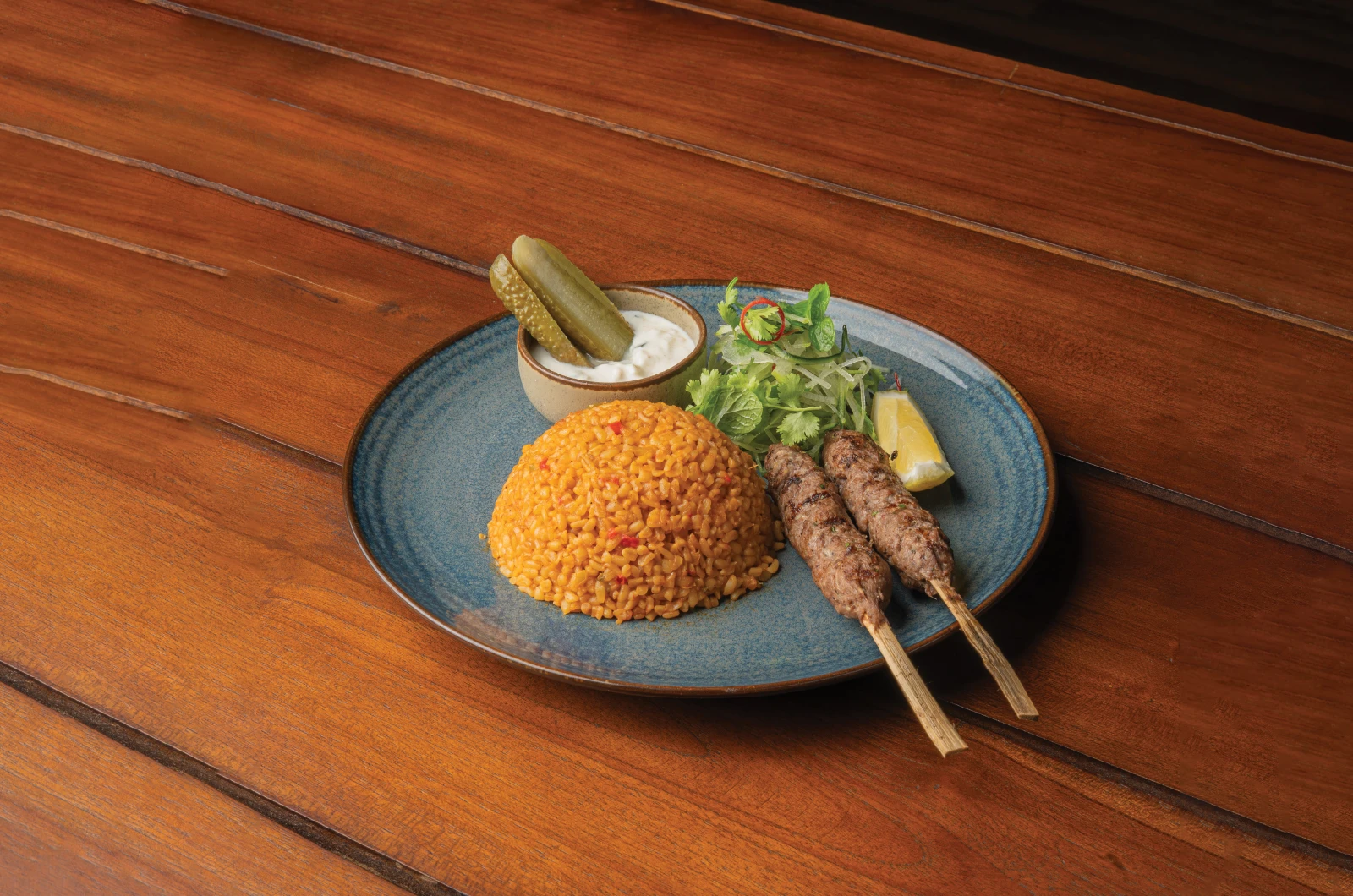 A warm, gently spiced dish inspired by Middle Eastern comfort fare, served with succulent lamb kofta and bright pineapple pickles for a balanced, satisfying finish.