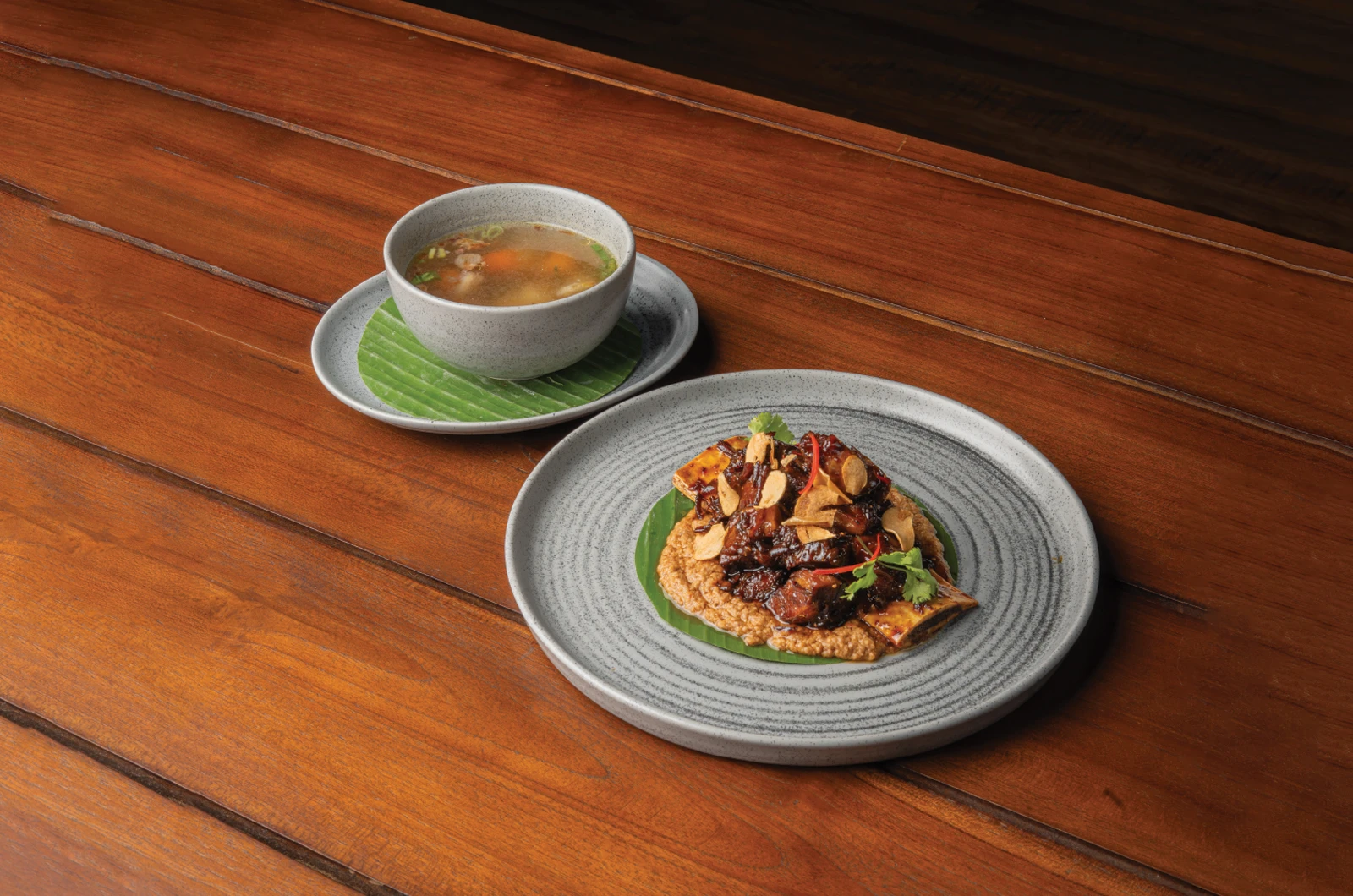 A celebration of bold Indonesian heritage, featuring tender grilled beef ribs with our signature sauce. sambal mangga, and crisp cucumber pickles, a refined Nusantara indulgence.