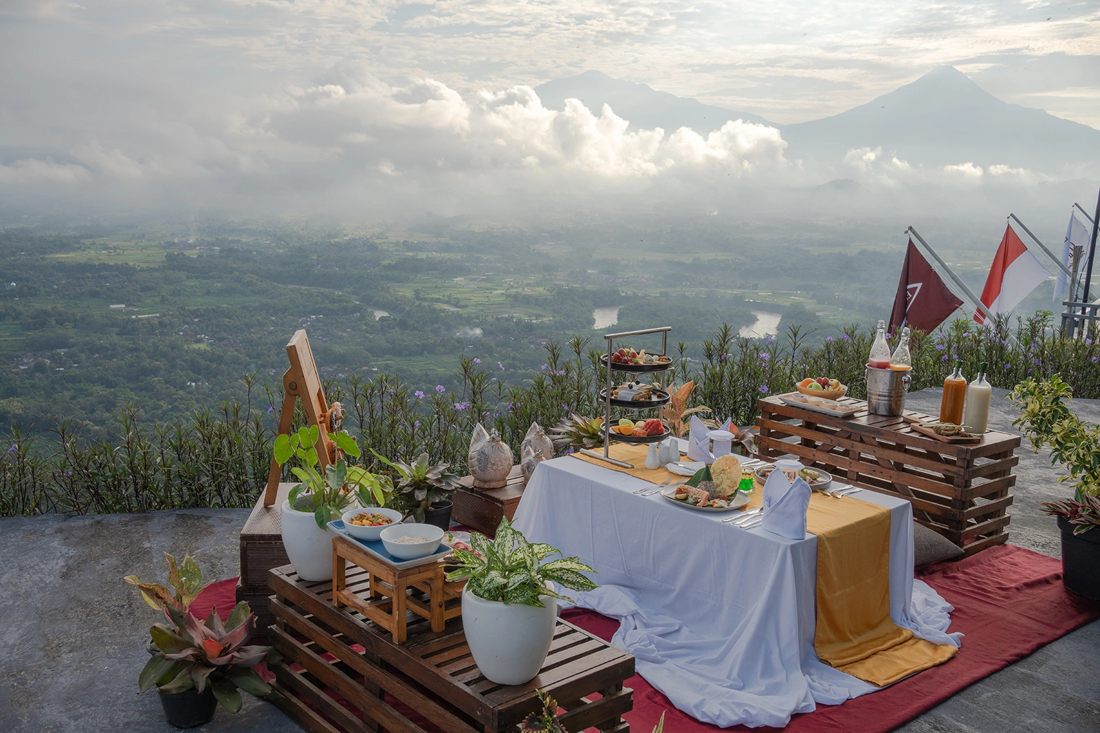 Rise before the dawn to climb Enam Langit; a scenic viewpoint in the Menoreh Hills overlooking rural villages and farmland in the Balkondes region. Watch the skies turn from black to gold and soak in the view as sunrise paints the valley below in the beautiful colours of morning. This is your beautiful and unforgettable backdrop for an exclusive picnic breakfast.