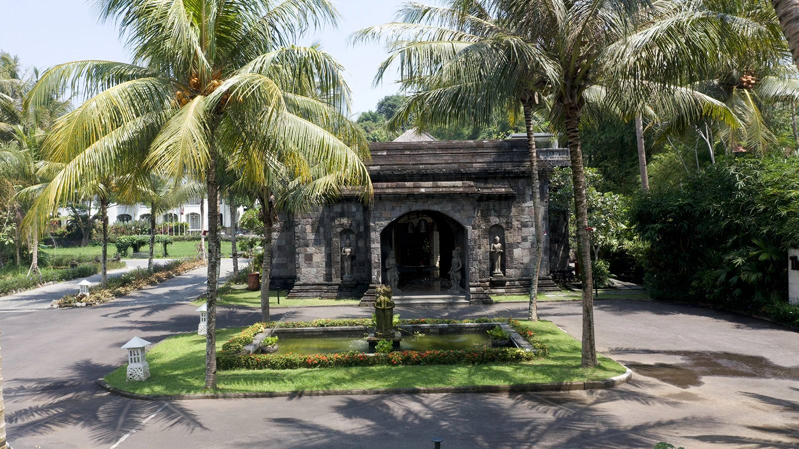 A serene stone pavilion framed by swaying palm trees, offering a grand yet tranquil welcome in the heart of nature.
